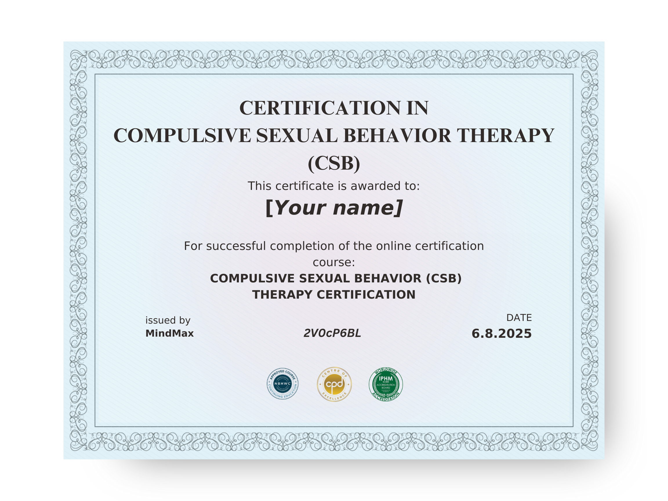 Upon completion, you’ll receive a personalized certificate as a Compulsive Sexual Behavior Therapy Practitioner (MindMax) - recognized by multiple international continuing-education bodies.