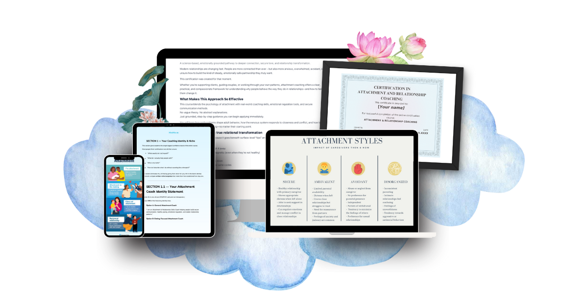 The Relationship Coaching Certification offers a structured, evidence-based approach to understanding patterns, guiding emotional regulation, and supporting secure connection. It provides the frameworks, tools, and communication methods used in professional relational work -designed to bring depth, clarity, and confidence to every interaction.