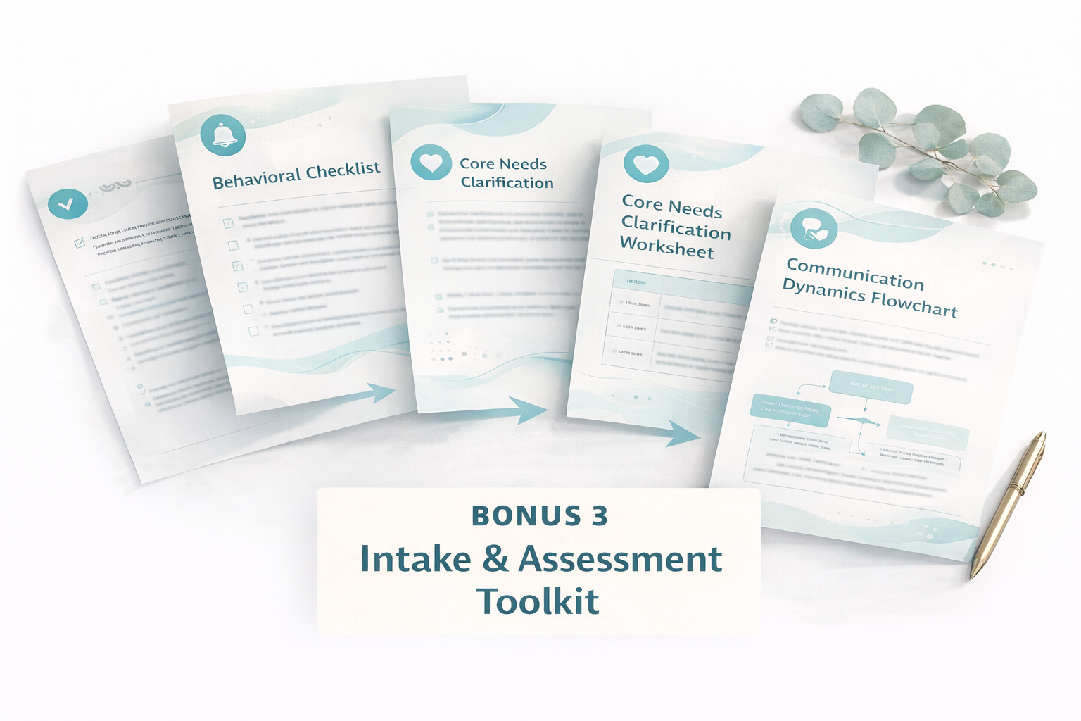 Assessment forms, intake templates, shutdown-pattern maps, communication scripts, and somatic exercises you can assign immediately — no extra prep required.